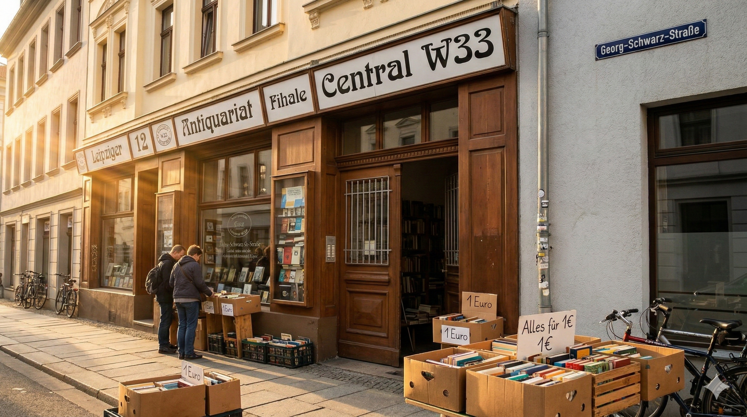 Zur Buchmesse 2015 öffnete das Leipziger Antiquariat die Tür zu seiner neuen Filiale „Central W33“ in der Georg-Schwarz-Straße 12 in Leipzig-Lindenau, gleich in der Nähe auch zum Stadtteil Plagwitz. Der Name leitet sich von dem bis in die 1960er-Jahre bestehenden Kino „Central-Lichtspiele“ im Hinterhof der Georg-Schwarz-Straße 11 ab. Der Eingang zum Kino befand sich direkt gegenüber von unserem Laden. Der zweite Bestandteil des Namens, W33, bezeichnet den alten Postleitzahl-Bereich für Lindenau innerhalb Leipzigs. Aber was ist das nun eigentlich für ein Antiquariat?
